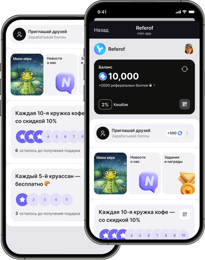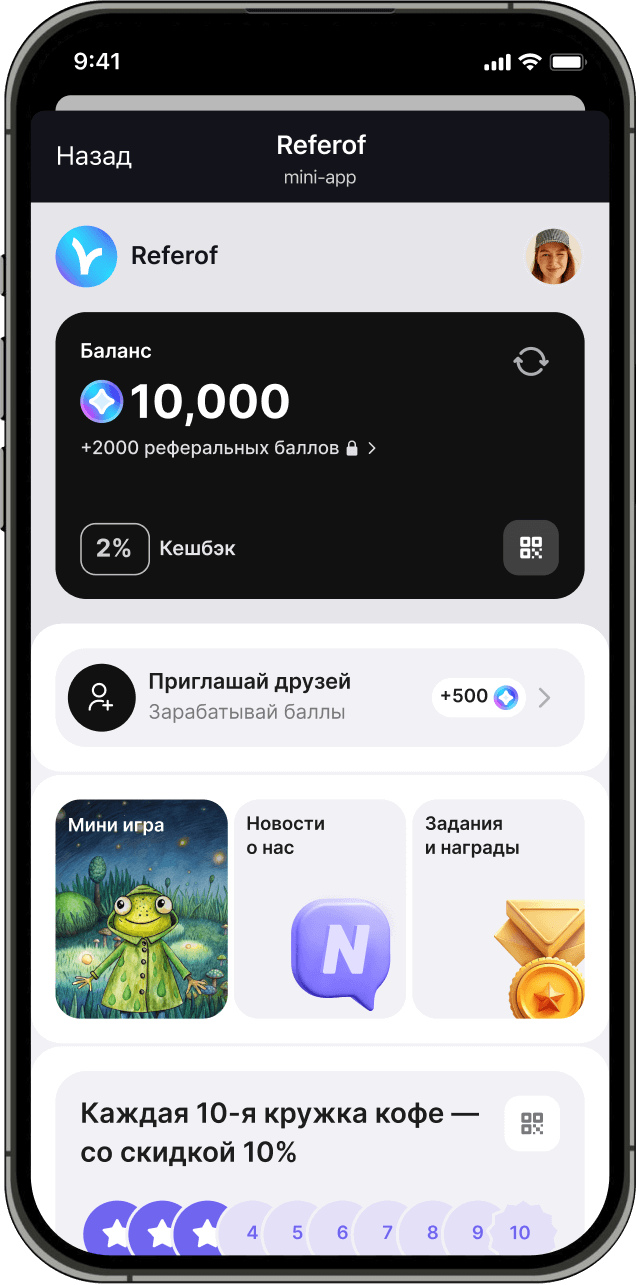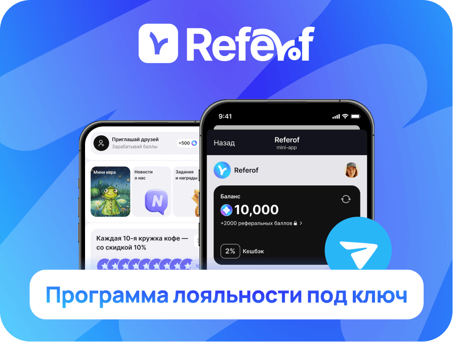 1. С Referof ваша программа лояльности уже доступна в Telegram Mini App. Клиенту достаточно один раз перейти к вашему боту — и он автоматически получает доступ к приложению, рассылкам и новостям